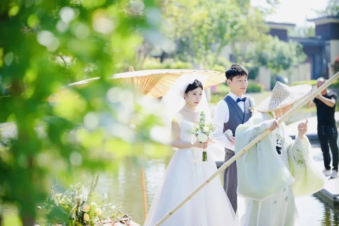 在婚旅打卡点打造上,金堂县以“龙凤呈祥”IP为核心,构建了多元融合的婚旅场景体系。五凤古镇依托南华宫等明清建筑,深度复原汉、唐、宋、明四朝婚俗礼仪,打造沉浸式传统国风婚典场景;天府橘乡以2300亩橘林为背景,串联花田小火车、树屋民宿、浪漫热气球等景观,推出“橘海盟约”主题婚拍线路,营造田园牧歌式的浪漫氛围;云漫半山作为新兴婚拍打卡地,让新人在山野之间感受自然宁静;科玛小镇则以其欧式风情建筑与淮州山水运动中心相映成趣,提供动静结合的婚拍体验;北坡集则凭借极简白建筑与270度全景落地窗,构建山顶天然摄影棚,融合法式优雅与侘寂美学策略通,成为新兴婚拍胜地。